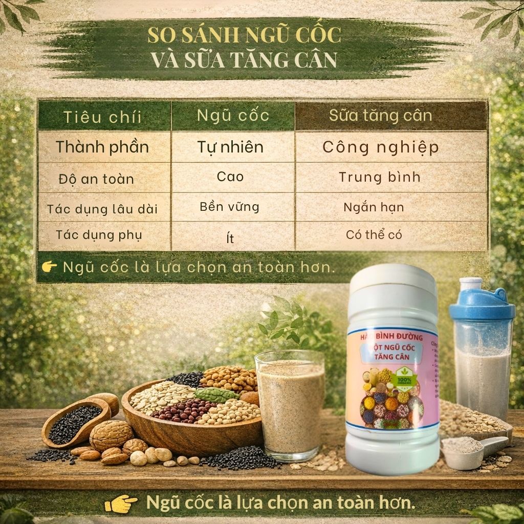 | Tiêu chí | Ngũ cốc | Sữa tăng cân |